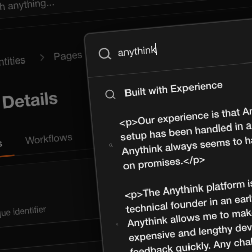 Learn more →Speed to market is important in the start-up world. Test ideas fast, with real users and grow as you learn. No need for complex system migrations Anythink can support you as your new venture turns into a complex enterprise.